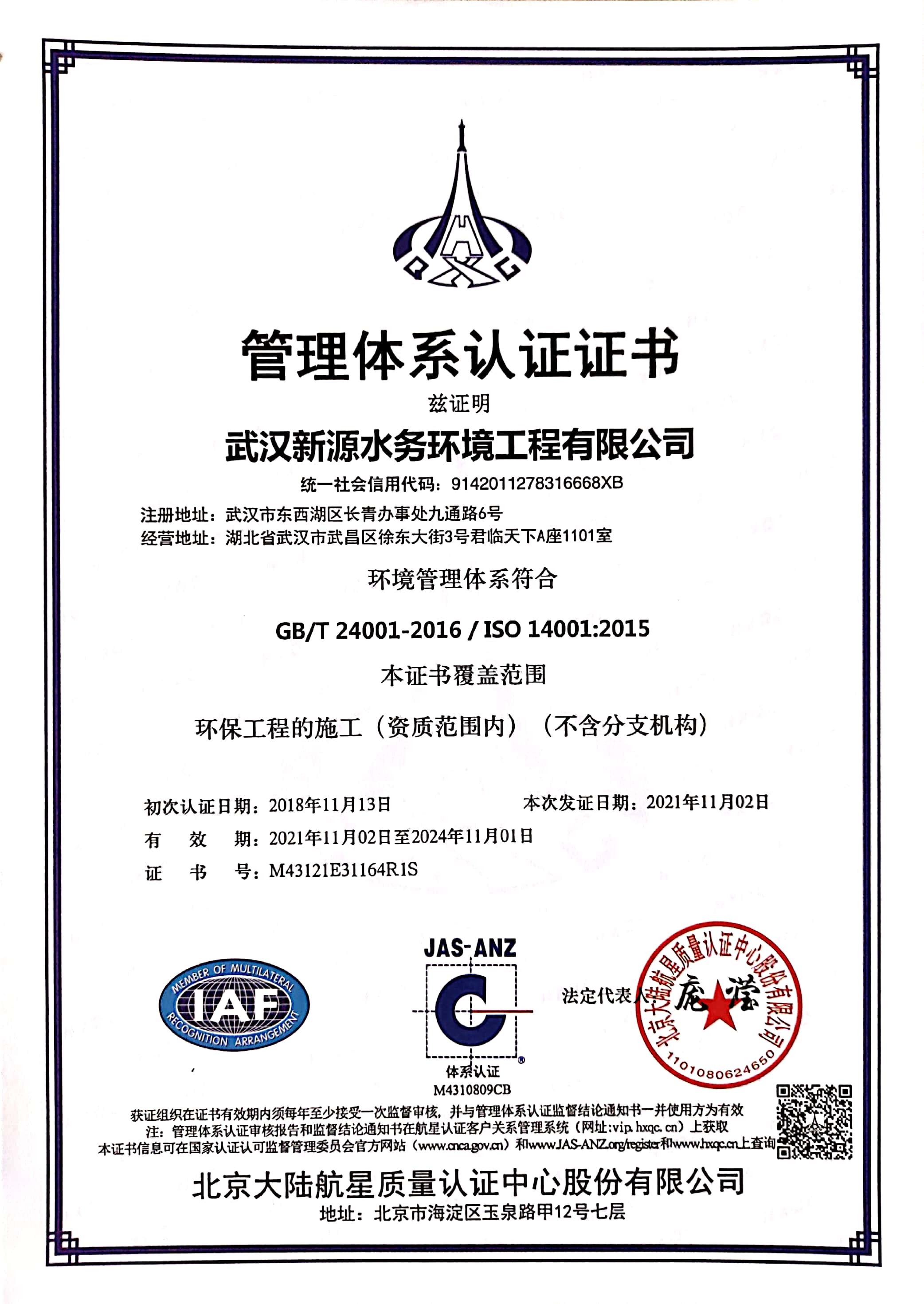 環(huán)境管理體系認證證書